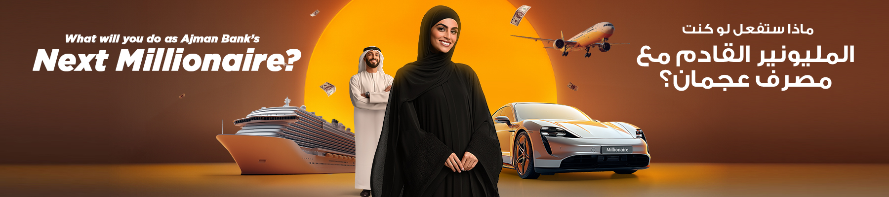 Save, Win and Become an Ajman Bank Millionaire, Start Saving now with the Ajman Bank Millionaire Account to get a chance to win 1 Million 2 times a year and 10 prizes of 5,000/- every month.