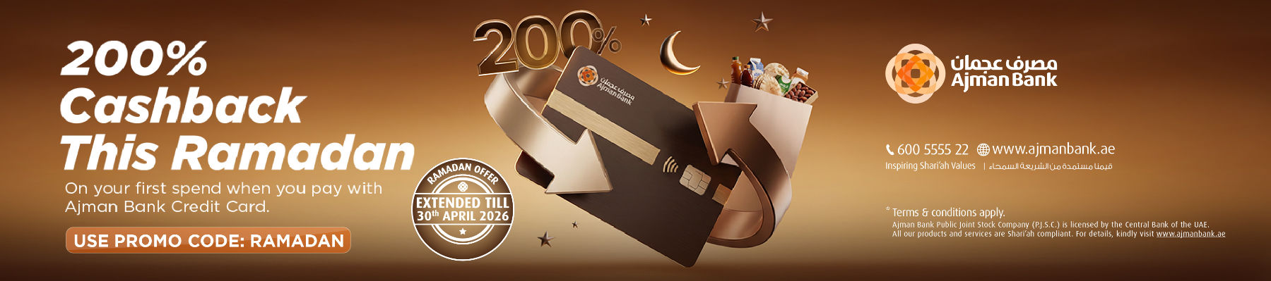 للاستفادة من مزايا هذه الحملة، على العميل إدخال الرمز الترويجي "Ramadan" عند تقديم طلب البطاقة عبر القنوات الرقمية، وذلك للاستحقاق للمكافأة الترحيبية الخاصة بالحملة.